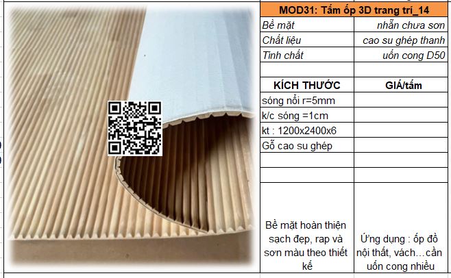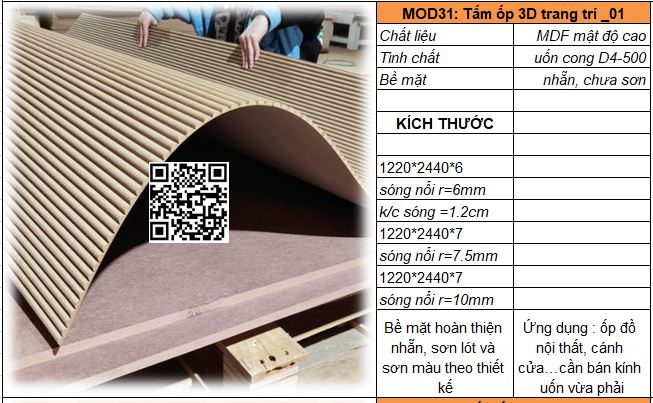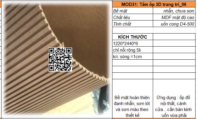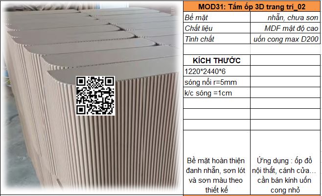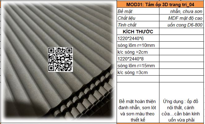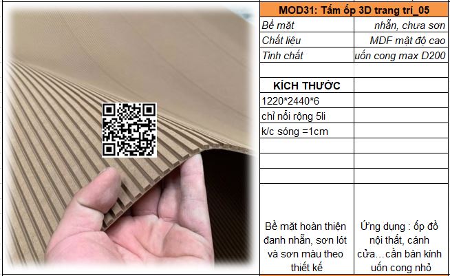 - Mã MOD31_02 : Tấm MDF mật độ cao dày 5-6mm có khả năng uốn cong D200, sóng nổi r = 5mm/ khoảng cách sóng = 10mm. Bề mặt đanh mịn dễ sơn bả hoàn thiện.