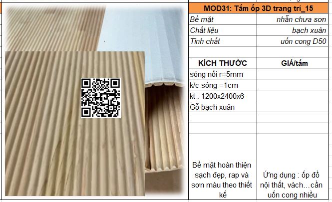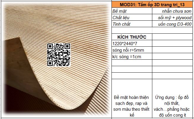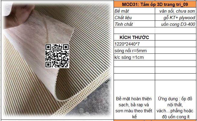 - Mã MOD31_09 : Tấm plywood kết hợp gỗ tự nhiên vân sồi trắng qua xử lý kỹ thuật dày 7-8mm có thể uốn cong D300-400. Sóng tròn nổi bán kính 5mm, khoảng cách sóng 10mm. Bề mặt bình thường cần bả rap và sơn hoàn thiện.