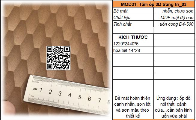 - Mã MOD31_03 : Tấm MDF mật độ cao ( tương đương HDF) dày 6mm có khả năng uốn cong D400 với kích thước họa tiết 15*30.
