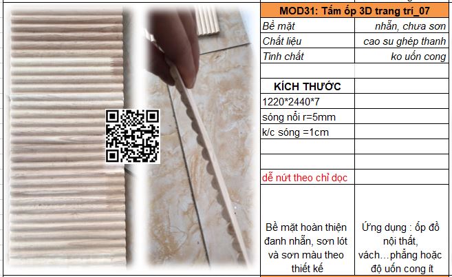 - Mã MOD31_07 : Tấm gỗ cao su ghép thanh dày 6mm không uốn cong. Sóng tròn nổi bán kính 5mm, khoảng cách sóng 10mm. Bề mặt đanh mịn dễ sơn bả hoàn thiện.