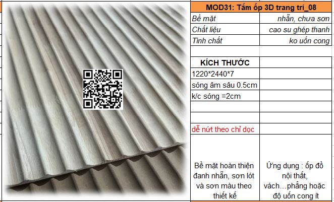 - Mã MOD31_08 : Tấm gỗ cao su ghép thanh dày 6mm không uốn cong. Sóng tròn âm bán kính 10mm, khoảng cách sóng 20mm. Bề mặt đanh mịn dễ sơn bả hoàn thiện.